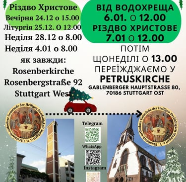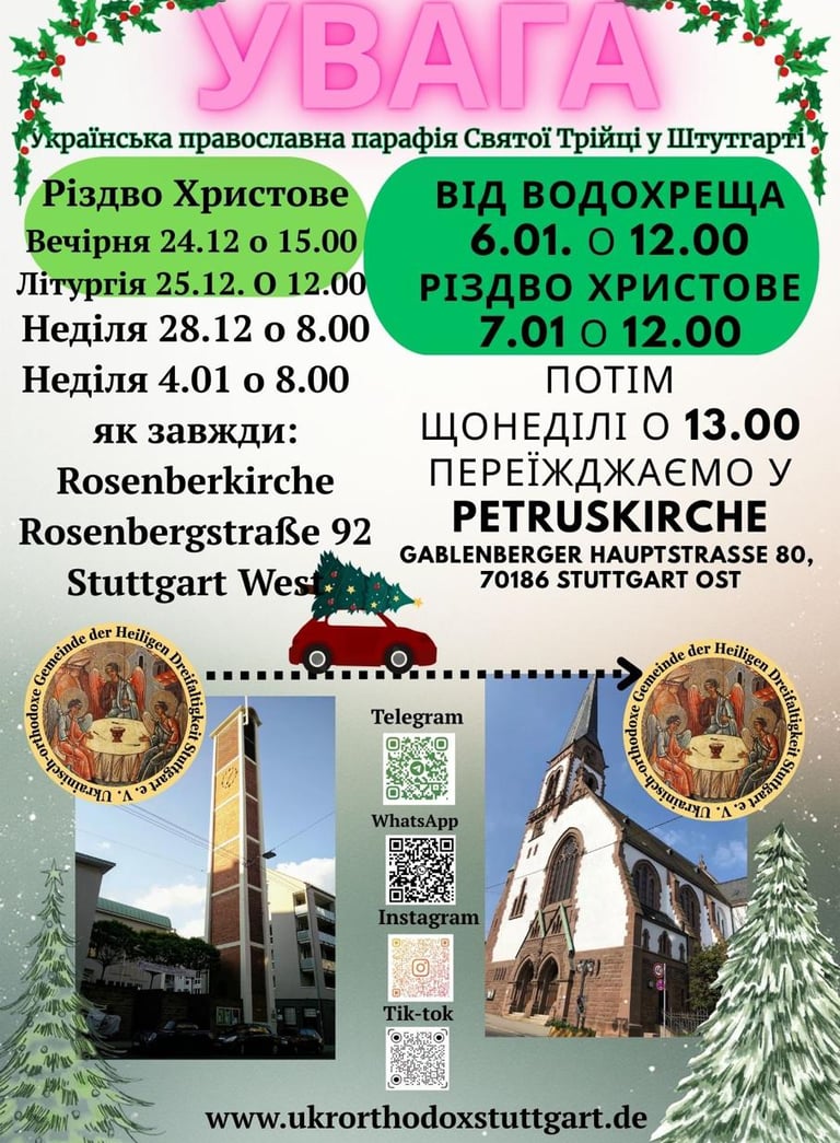 Всі богослужіння у грудні й також 4 січня ми, Українська православна громада Святої Трійці м. Штутгарт, проводимо як і раніше, у церкві Rosenbergkirche за адресою Rosenbergstraße 92. А починаючи від свята Водохреща, тобто від 6 січня 2026 року, матимемо нову домівку — гарну церкву Petruskirche за адресою Gablenberger Hauptstraße 80, 70186 Stuttgart Ost. Недільні літургії там починатимуться о 13:00, але 6 та 7 січня — о 12:00. Загалом просимо слідкувати за розкладом богослужінь на сайті або в соціальних мережах.